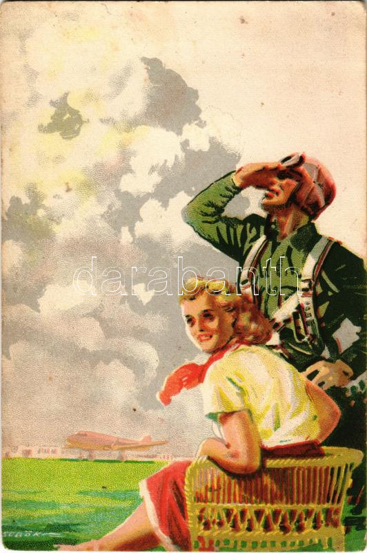 1959 Az ég kék színe időjárásjelző festékkel készült, ha a kék szín rózsaszínűre változik nedves, esős idő várható. Derült, száraz időjárást a kék szín jelzi. Napsütött helyen tartsuk! Kiadja a Magyar Repülőszövetség (MRSz) Repülősajtó, szocreál propaganda (EK)