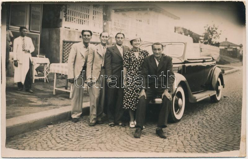 1937 Bucharest, Bukarest, Bucuresti, Bucuresci; Dobay István a RIPENSIA Temesvár labdarúgója és román válogatott focista feleségével és játékostársaival (Bürger, Marcu, Parlovici) / Stefan Dobay, player of the Romanian National football team and Ripensia Timisoara FC, with his wife and teammates (Bürger, Marcu, Parlovici). photo (ragasztónyomok / gluemarks)