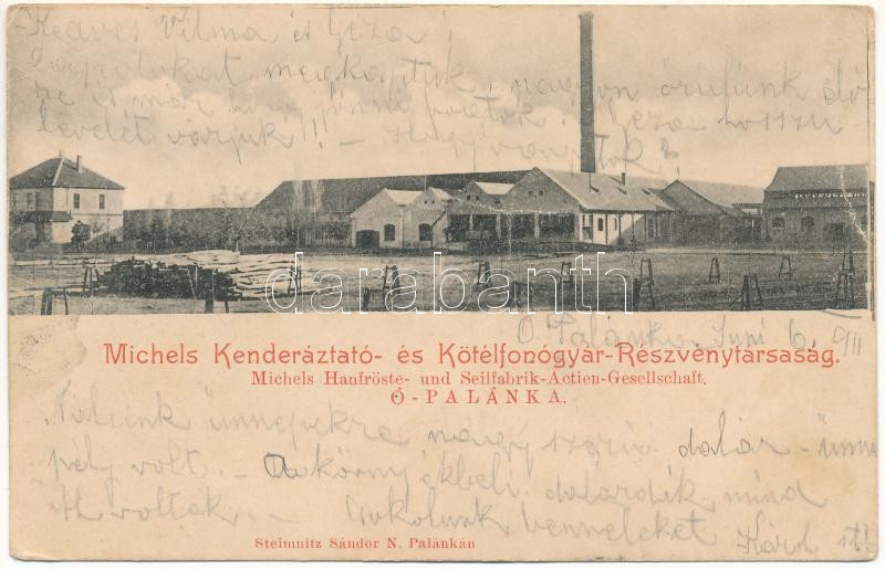 Leírás: 1911 Ópalánka, Stara Palanka (Palánka, Backa Palanka); Michels Kenderáztató- és Kötélfonógyár részvénytársaság. teimnitz Sándor kiadása / Hemp and Rope Spinning Factory (EK)
