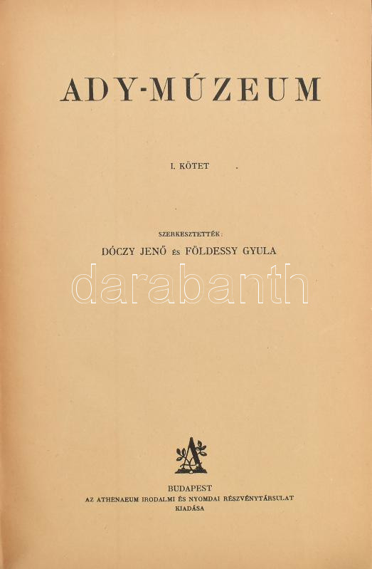 Ady-múzeum. I-II. köt. [Egy kötetben]. Szerk.: Dóczy Jenő és Földessy ... https://www.darabanth.com/hu/466-Gyorsarveres/466.0/Konyvek/Konyvek-Egyeb-ritkasagok~500042/Ady-muzeum-I-II-kot-Egy-kotetben-Szerk-Doczy-Jeno-es-Foldessy-Gyula-Bp-1924-Ath~II3087938