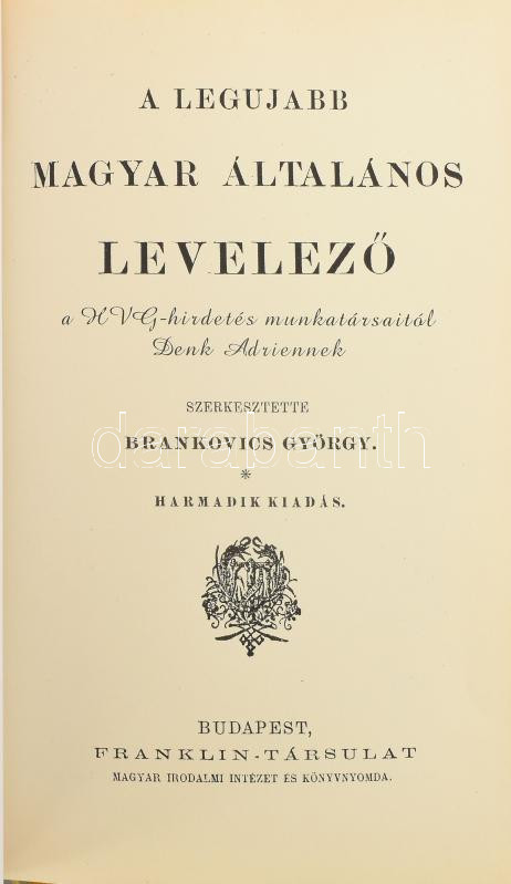 Brankovics György: A legujabb magyar általános levelezÅ‘. A magán- és a kereskedelmi élet minden viszonyaira. Szerk.: - -. [Bp.], én., Pytheas. Hasonmás kiadás. Kiadói kartonált papÃrkötés.