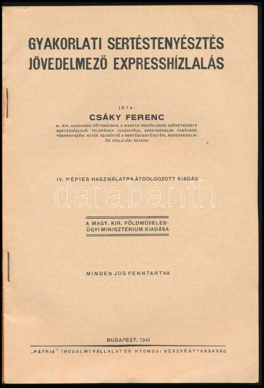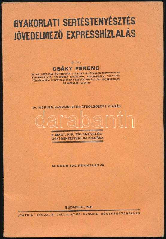 Csáky Ferenc: Gyakorlati sertéstenyésztés jövedelmező expresshízlalás.... https://www.darabanth.com/hu/466-Gyorsarveres/466.0/Konyvek/Konyvek-Egyeb-ritkasagok~500042/Csaky-Ferenc-Gyakorlati-sertestenyesztes-jovedelmezo-expresshizlalas-Bp-1941-Patria-~II3096663
