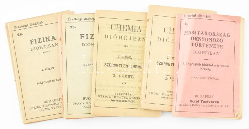 Érettségi dióhéjak 7 száma: Magyarország oknyomozó története dióhéjban. A legrégibb időktől a trianoni békéig. Harmadik kiadás.Bp.,1927 ,Aczél Testvérek,(Uránia-ny.); Chemia dióhéjban. I. rész. Szervetlen chemia. 1-2. füzet. Veszprém,1922.,Krausz Ármin.; Fizika dióhéjban. 1-2. füzet. Bp., 1926-én., Uránia - Aczél-Testvérek.; Fizika dióhéjban. II. rész. 1. füzet. Veszprém, én., Krausz Ármin Fia.; Fizika dióhéjban. 4. füzet. (II. r ész. II. füzet.) 2. kiadás. Bp., ,Uránia (Aczél Testvérek.); Kiadói papírkötések, változó állapotban.