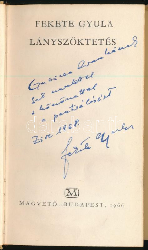 Fekete Gyula: Lányszöktetés. DEDIKÁLT! Bp., 1966, Magvető. Kiadói egés... https://www.darabanth.com/hu/466-Gyorsarveres/466.0/Konyvek/Konyvek-Egyeb-ritkasagok~500042/Fekete-Gyula-Lanyszoktetes-DEDIKALT-Bp-1966-Magveto-Kiadoi-egeszvaszon-kotes-kiadC3~II3144125