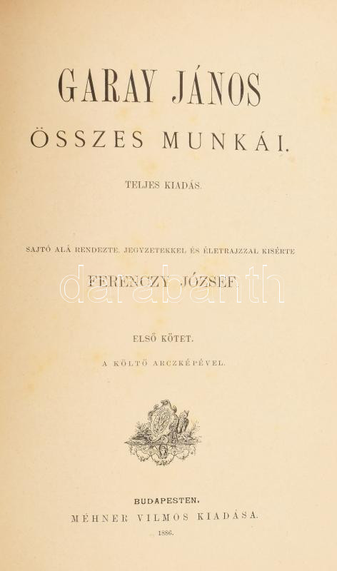 Garay János összes munkái I. köt. Sajtó alá rendezte, jegyzetekkel és életrajzzal kísérte: Ferenczy József. Bp., 1886, Méhner Vilmos, 1 (Garay János arcképe) t.+LXIV+360 p. Kiadói dúsan aranyozott, festett, illusztrált egészvászon-kötés, Goldschmied és Társai-kötés, aranyozott lapélekkel, kissé kopott borítóval, ajándékozási sorokkal.