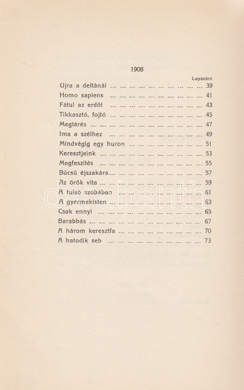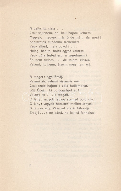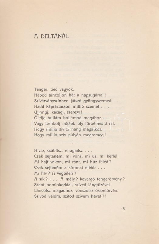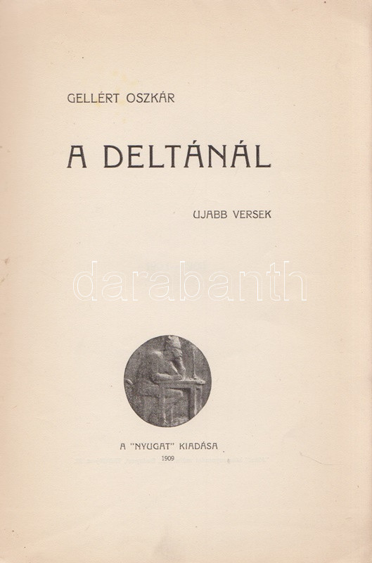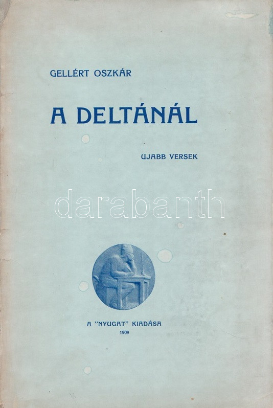 Gellért Oszkár: A deltánál. Ujabb versek. (Budapest), 1909. A ,,Nyugat" kiadása (,,Jókai" könyvnyomdai műintézet). 75 + [5] p. Első kiadás. A költő, újságíró második verseskötete. Gellért Oszkár (1882-1967) a konzervatív Uj Idők és a szabadelvű Budapesti Napló, majd a Pesti Napló munkatársa és hadi tudósítója, majd 1917-től a Nyugat főmunkatársa volt. 1919-1920. évi rövid politikai szereplését követően - a Vörösmarty Akadémia tagja és a Tanácsköztársaság sajtóirodájának vezetője volt - visszavonult a politikától, katolizált, valamint a Nyugat belső köreihez tartozott, egészen annak megszűnéséig. Fűzve, kiadói borítóban. Körülvágatlan, jó példány.
