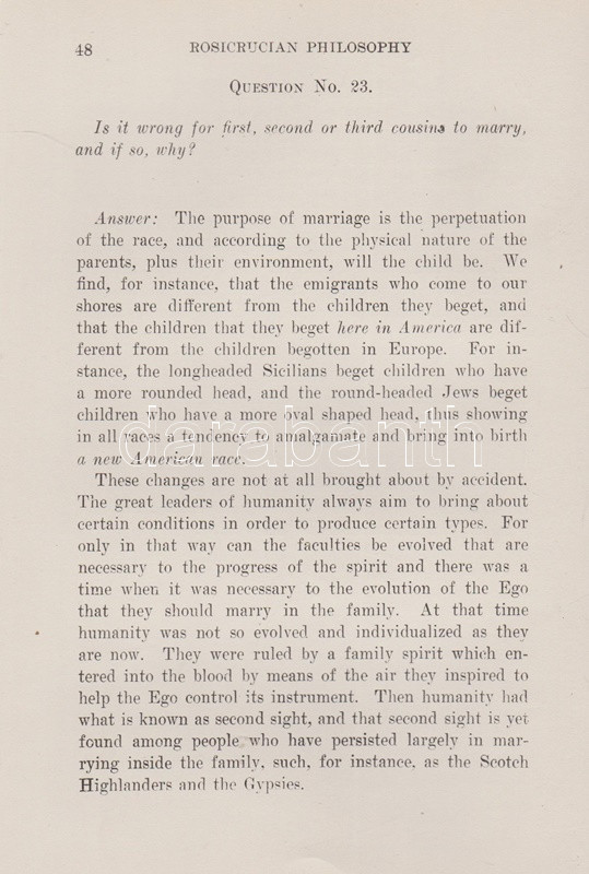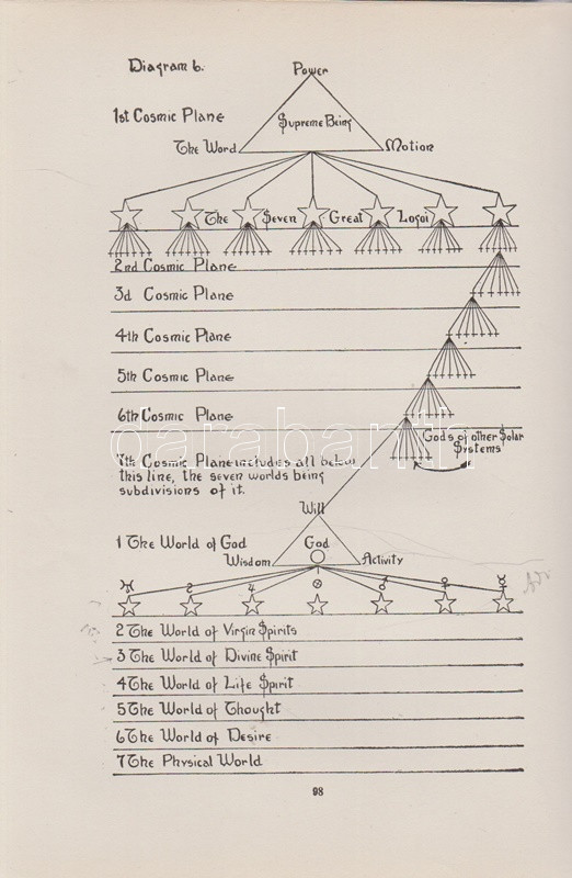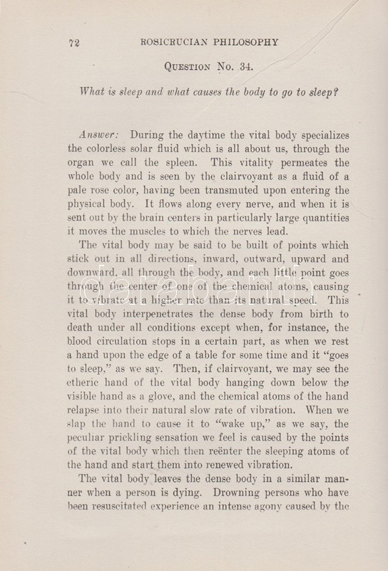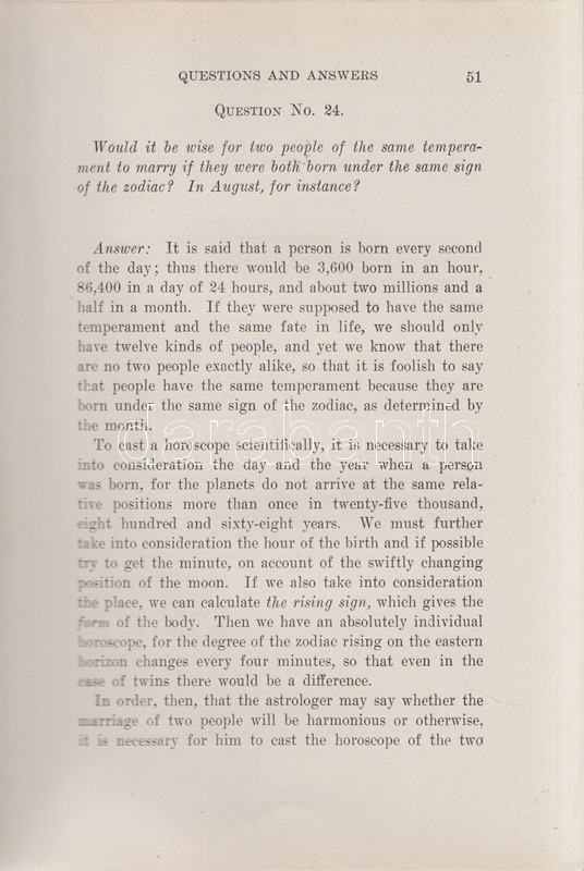 Heindel, Max: The Rosicrucian Philosophy in Questions and Answers. Chicago, (1910). Rosicrucian Fellowship [ny. n.] 430 + [2] p. Első kiadás. Max Heindel (1865-1919) a dán származású amerikai okkultista, asztrológus és misztikus, az amerikai Rózsakeresztes Testvériség alapítójának angol nyelvű, kérdés-válasz formájában kidolgozott okkult filozófiája, mely a végső kérdésekre éppúgy válaszol, mint praktikus kérdésekre. A munka nyolc fejezetben tárgyalja az élet, a világmindenség, a morál, a biológia, a lélek, a megvilágosodás, a spiritiszta praktikák, a rózsakeresztes életmód és ideológia kérdéseit. Az egyes fejezetek: Élet a Földön - Élet a halál után - Újjászületés - A Biblia tanításai - Spiritiszta jelenségek - Távolbalátás - Asztrológia - Állatvilág. Egyes fejezetek élén egész oldalas összefoglaló ábrák a lélek szerkezetéről, a Föld - és általánosságban a kozmosz - valódi összetételéről, a teremtés rendjéről (mely titkos ismeretek egyetlen ábrában is közölhetőek). Max Heindel (1865-1919), a jeles okkultista vállalkozó Carl Louis Fredrik Grasshoff néven született Dániában; betegségekkel tarkított gyermekkora után hajógépészetet tanult Skóciában, majd az Egyesült Államokban több helyen dolgozott gépészként, egyúttal teozófiai előadásokat hallgatott, illetve elmélyült a teozófia szakirodalmában. A szerző számos jeles teozófus előadásán jelen volt, szorgosan jegyzetelt, később az előadások velejét - egyes visszaemlékezések szerint - saját műveiként tüntette fel. Max Heindel a plágiumot természetesen nem ismerte el, állításai szerint művének ihletője az Idősebb Testvérnek nevezett szellemi lény volt, amerikai okkult tanulmányai után e szellemlény útmutatásai szerint utazott Európa-szerte, és nyert bepillantást a magasabb misztériumokba. E tapasztalatokkal felvértezvén Seattle városában 1909-ben megalapította az ezoterikus elmélyedéssel és szellemi gyógyítással foglalatoskodó amerikai Rózsakeresztes Testvériséget, mely a mai napig létezik. A címoldalon régi tulajdonosi bélyegzés, illetve bejegyzés. Poss: Gyöngyöshalászy Takách Béla. [Gyöngyöshalászy Takách Béla (1874-1947) festő, építész, iparművész. A budapesti József Műegyetemen szerzett diplomája után Alpár Ignác mellett dolgozott Franciaországban, majd tíz évet töltött az Egyesült Államokban, ahol Alfons Mucha tanítványa volt. Kiállításai voltak New York, Boston, Philadelphia és Charleston városaiban. Az 1910-es években tért haza, itthon Széchenyi Bertalan, Dohnányi Ernő, Kozma Jenő villáit tervezte.] Aranyozott, festett, a Rózsakeresztes Testvériség szimbólumával illusztrált kiadói egészvászon kötésben, aranyozott festésű lapszélekkel. Jó példány.