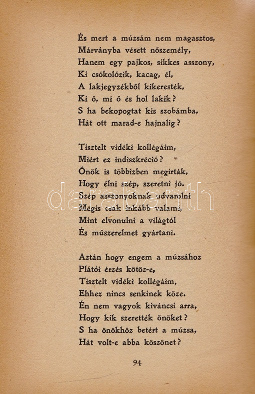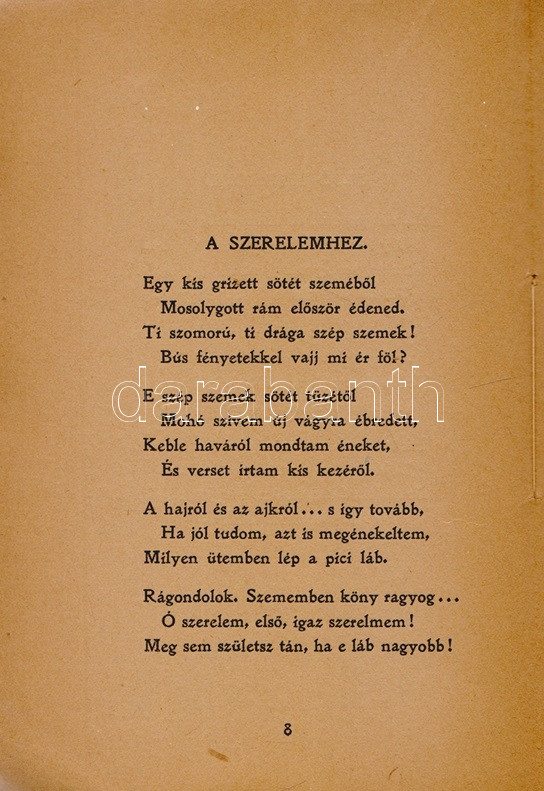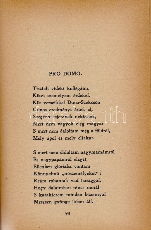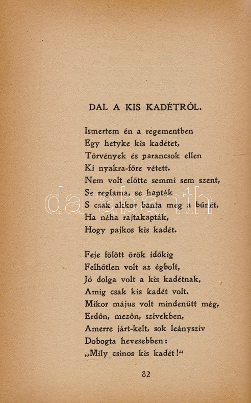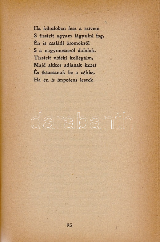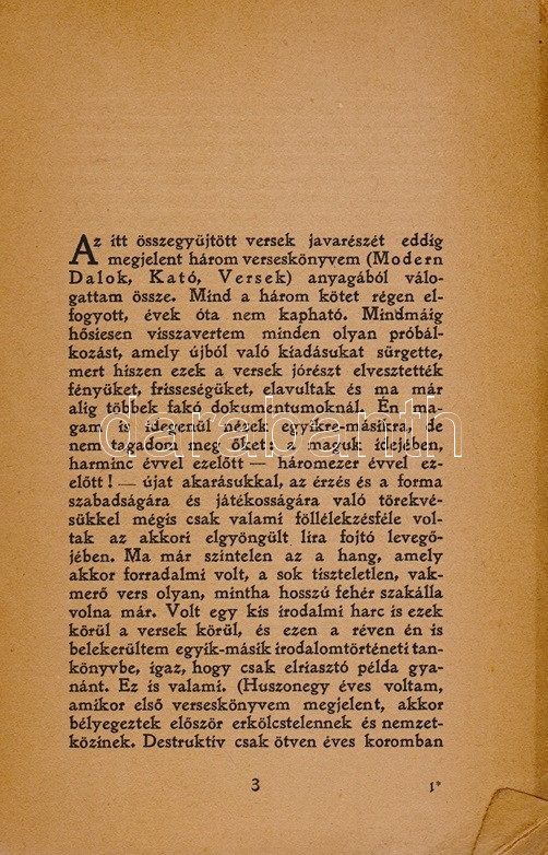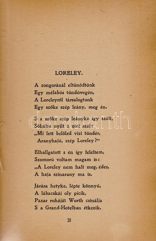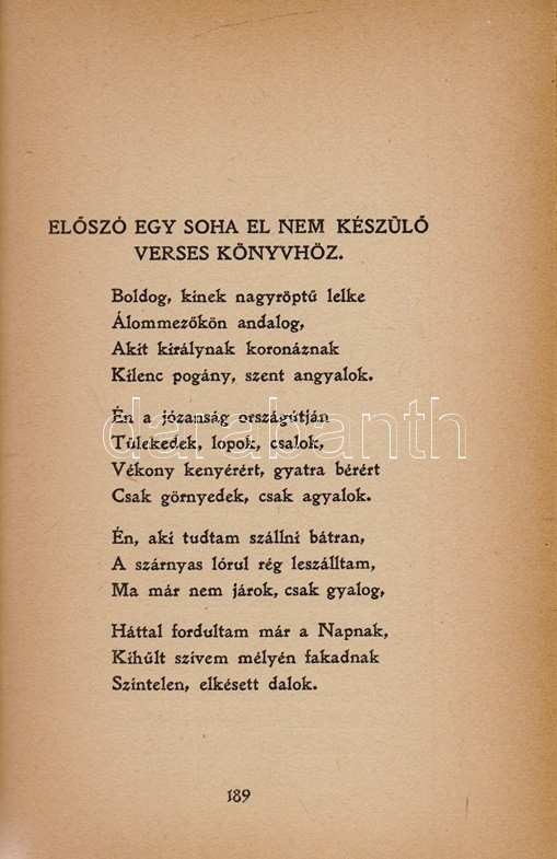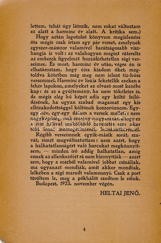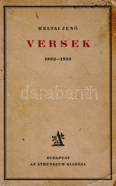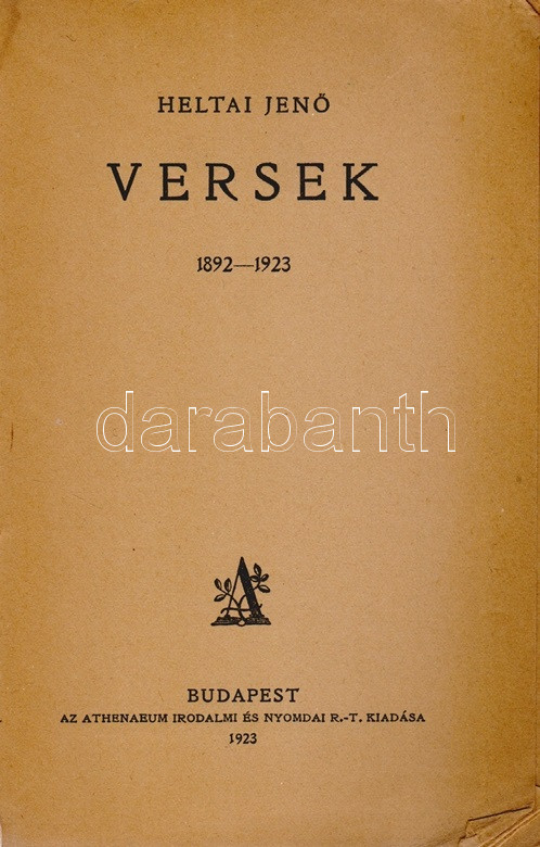 Heltai Jenő: Versek 1892-1923. Budapest, 1923. Athenaeum Irodalmi és Nyomdai Rt. 215 + [1] p. Egyetlen kiadás. Heltai Jenő válogatott versei. Részlet az előszóból: ,,Az itt összegyűjtött versek java részét eddig megjelent három verseskönyvem anyagából válogattam össze. Mind a három kötet régen elfogyott, évek óta nem kapható. Mindmáig hősiesen visszavertem minden olyan próbálkozást, amely újból való kiadásukat sürgette, [...] hiszen ezek a versek jórészt elvesztették fényüket, frisseségüket, elavultak és ma már alig többek fakó dokumentumoknál. Én magam is idegenül nézek egyikre-másikra, de nem tagadom meg őket: a maguk idejében, harminc évvel ezelőtt - háromezer évvel ezelőtt! - újat akarásukkal, az érzés és a forma szabadságára és játékosságára való törekvésükkel mégis csak valami föllélekzésféle voltak az akkori elgyengült líra fojtó levegőjében. Ma már színtelen az a hang, amely akkor forradalmi volt, a sok tiszteletlen, vakmerő vers olyan, mintha hosszú fehér szakálla volna már. Volt egy kis irodalmi harc is ezek körül a versek körül, és ezen a réven én is belekerültem egyik-másik irodalomtörténeti tankönyvbe, igaz, hogy csak elriasztó példa gyanánt. Az is valami. (Huszonegy éves voltam, amikor első verseskönyvem megjelent, akkor bélyegeztek először erkölcstelennek. Destruktív csak ötven éves koromban lettem, tehát úgy látszik, nem sokat változtam ez alatt a harminc év alatt. A kritika sem.)" Példányunk fűzése meglazult. Fűzve, enyhén sérült, foltos, enyhén gyűrött kiadói borítóban. Körülvágatlan példány.