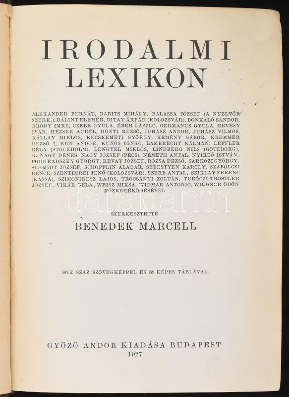Irodalmi lexikon. Szerk.: Benedek Marcell. Sok száz szövegképpel és 88 képes táblával. Bp., 1927, Győző Andor. Kiadói aranyozott, dombornyomott egészvászon-kötés.