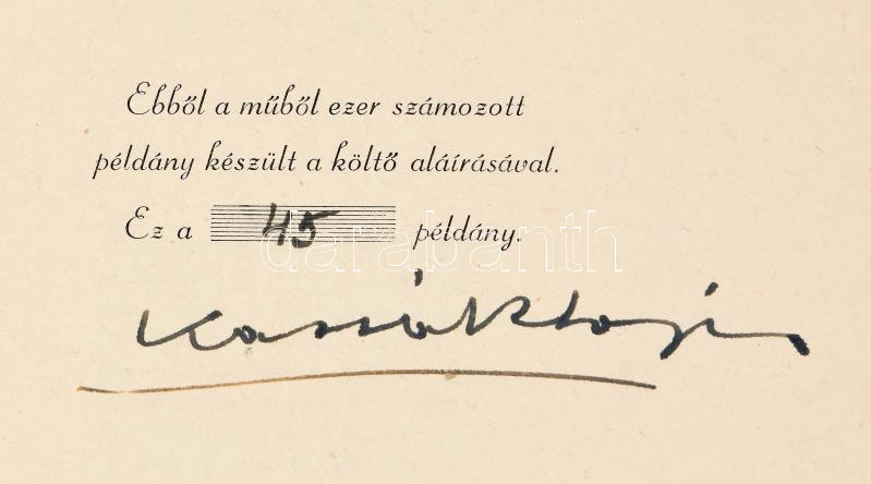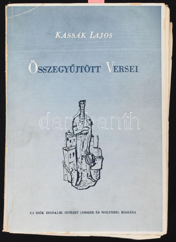 Kassák Lajos összegyűjtött versei. (Számozott, aláírt). Bp., [1945], Új Idők Irodalmi Intézet (Singer és Wolfner), 470 p. Kiadói papírkötés, sérült borítóval és gerinccel, nagyrészt felvágatlan lapokkal. Számozott (45./1000), a szerző, Kassák Lajos (1887-1967) író, költő, műfordító, képzőművész által aláírt példány.