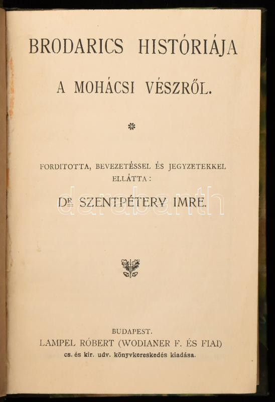 Kolligátum 5 műből: Brodarics históriája a mohácsi vészről. Ford., bevezetéssel és jegyzetekkel ellátta: Dr. Szentpétery Imre.; Szemelvények Priskos rhetor töredékeiből. Ford. és magyarázata: Szilágyi Sándor.; Roger mester siralmas éneke a tatároktól elpusztított Magyarországról. Ford., bevezetéssel és magyarázó jegyzetekkel ellátta: Dr. Turchányi Tihamér.; Tinódi Sebestyén válogatott históriás énekei. Rend. és bev.: Perényi Adolf.; Aranyas-Rákosi Székely Sándor: A székelyek Erdélyben. Hősköltemény három énekben. Bev. és sajtó alá rend.: Barátosi Balogh Benedek. Bp., 1903-1904, Lampel R. (Wodianer F. és Fiai). Átkötött félvászon-kötésben, jó állapotban, körbevágott lapokkal.