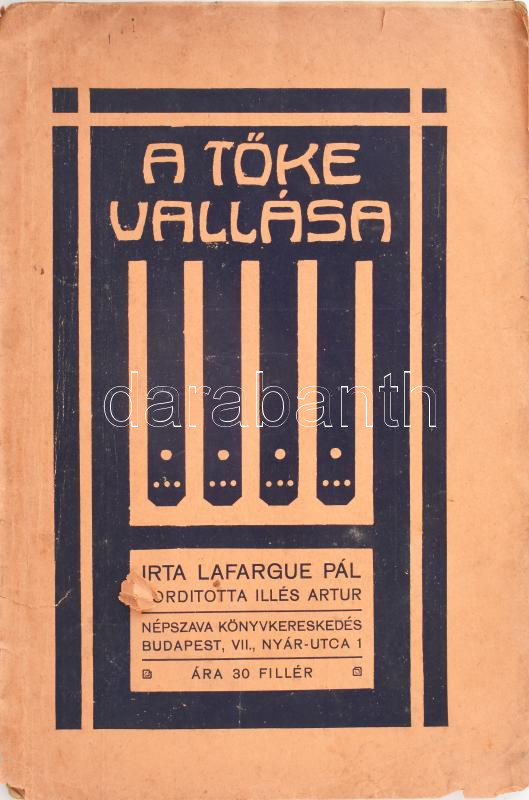 Lafargue Pál: A tőke vallása. Fordította: Illés Artur. Bp., 1907, Népszava Könyvkereskedése. 31 p. Első kiadás! Kiadói papírkötésben, sérült gerinccel és borítóval, kissé foltos lapokkal.