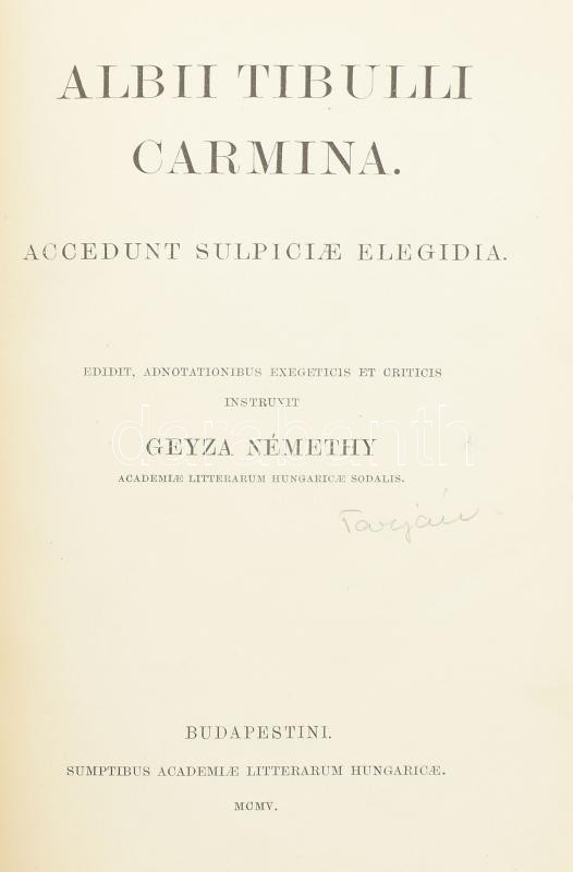 Némethy, [Géza] Geyza: Albii Tibulli Carmina. Acedunt Sulpiciae Elegid... https://www.darabanth.com/hu/466-Gyorsarveres/466.0/Konyvek/Konyvek-Egyeb-ritkasagok~500042/Nemethy-Geza-Geyza-Albii-Tibulli-Carmina-Acedunt-Sulpiciae-Elegidia-Editiones-Criticae-Scrip~II3145378