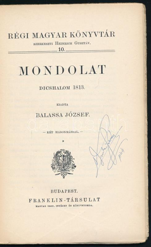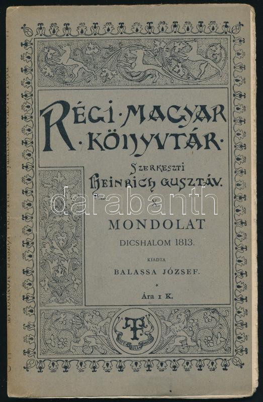 Leírás: Régi Magyar Könyvtár X. köt.: Mondolat. Dicshalom 1813. Kiadta Balassa József. Bp., én., Franklin. Kiadói papírkötés, szakadt borítóval.
