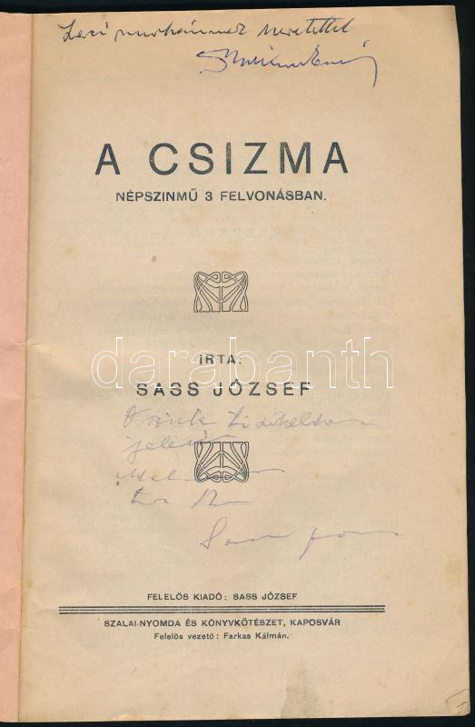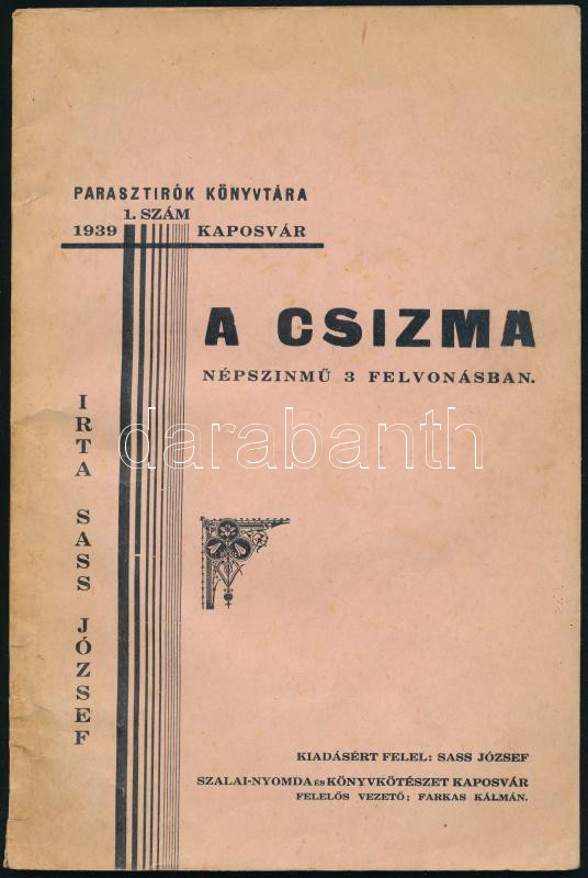 Sass József: A csízma. Népszínmű 3 felvonásben Parasztírók könyvtára, ... https://www.darabanth.com/hu/466-Gyorsarveres/466.0/Konyvek/Konyvek-Egyeb-ritkasagok~500042/Sass-Jozsef-A-csizma-Nepszinmu-3-felvonasben-Parasztirok-konyvtara-Kaposvar-1939-1-~II3088856
