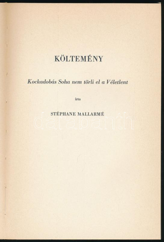 Stéphane Mallarmé: Kockadobás. Ford. és a tanulmányt írta: Tellér Gyul... https://www.darabanth.com/hu/466-Gyorsarveres/466.0/Konyvek/Konyvek-Egyeb-ritkasagok~500042/Stephane-Mallarme-Kockadobas-Ford-es-a-tanulmanyt-irta-Teller-Gyula-Helikon-Studio-V-~II3147185