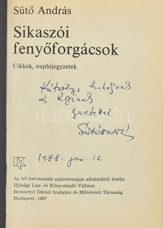 Sütő András: Sikaszói fenyőforgácsok. Cikkek, naplójegyzetek. A szerző, Sütő András (1927-2006) író által Kútvölgyi Mihály (1944-?) fotóművész részére DEDIKÁLT példány! Bp., 1987,Ifjúsági. Kiadói papírkötés.