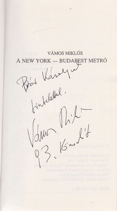 Dedikált: ,,Boór Károlynak tisztelettel: Vámos Miklós. [19]93. könyvhét".