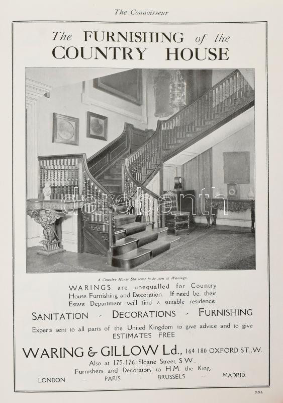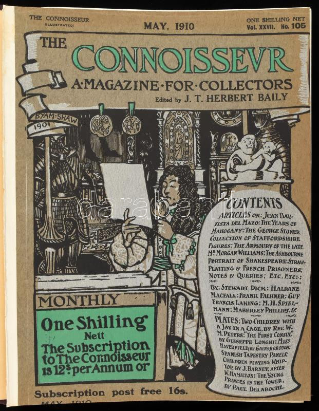1910 The Connnoisseur. A magazine for collectors. Vol. XXVII No. 105-111 (Fél évfolyam, május-nov.). Gazdag képanyaggal. Aranyozott gerincű későbbi félvászon kötésben, körbevágva, első két lap kijár, egy illusztrációt kivágtak, a kivágható képeslapokat kivették