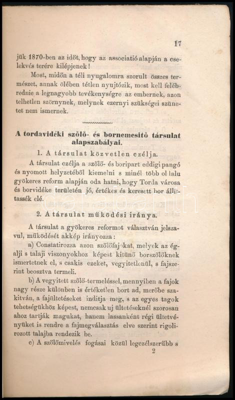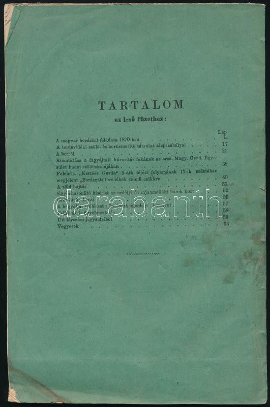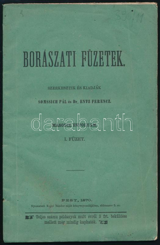 1870 Borászati Füzetek. II. évf. 1. füzet. 1870. január. Pest, 1870, Kocsi Sándor, 64 p. A hátsó borítón tartalomjegyzékkel, benne érdekes írásokkal, közte: "A tordavidéki szőlő- és bornemesítő társulat alapszabályai."Kiadói papírkötés, foltos borítóval.