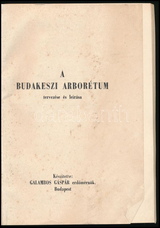 Galambos Gáspár: A Budakeszi Arborétum tervezése és leírása. Budakeszi, (1972), Telki Állami Erdő- és Vadgazdaság. Fekete-fehér fotókkal illusztrálva. Kiadói papírkötés, foltos borítóval, helyenként kissé foltos lapokkal, a borítón tulajdonosi névbejegyzéssel. Megjelent 1024 példányban.