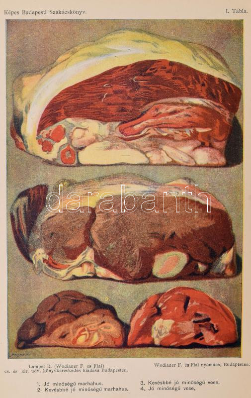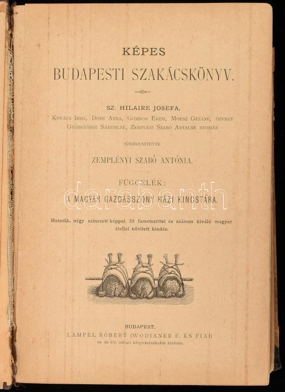 Zemplényi Szabó Antónia: Képes budapesti szakácskönyv. Sz. Hilaire Josefa, Kovács Irma, Dorn Anna, Gombos Erzsi, Moesz Gézáné, özvegy Gyöngyössy Sámuelné, Zemplényi Szabó Antalné nyomán szerkesztette: - -. Függelék: a Magyar gazdasszony házi kincstára c. munkával. Hatodik, négy színezett képpel, 53 fametszettel és számos kiváló magyar étellel bővített kiadás. Bp.,[1896],Lampel R. (Wodianer F. és Fiai),1 t.+4+550+XIX+3 p.+3 t. Kiadói illusztrált félvászon-kötés, kopott borítóval, sérült gerinccel, a hátsó szennylap hiányzik, az elülső szennylap és az első két lap kijár, egy lap lyukas (255/256) és az előtte lévő lapra ragadt a lyuk (253/254), egy lap sérült, javított (257/258), 259-273 között hiányzó lapokkal, néhány lapon kis szakadás, kis folt.