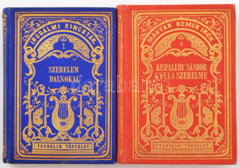 Leírás: 2 db minikönyv - Magyar Remekírók. Irodalmi Kincstár - Kisfaludy Sándor: Gyula szerelme. Bp., 1889, Franklin. Kiadói aranyozott egészvászon kötés, aranyozott lapélek, kijáró lapok, kissé kopottas állapotban. + Szerelem dalnokai. Válogatott gyűjtemény II. kötet. Pest, 1863, Heckenast. Kiadói aranyozott egészvászon kötés, aranyozott lapélek, kissé kopottas állapotban.