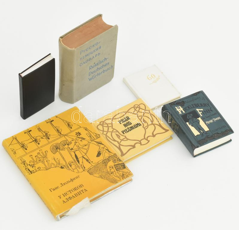 6 db vegyes minikönyv: Egy hatvanéves fiatalember (Emlékkönyv Siklósi Norbert 60. születésnapjára); Mark Twain: Adventures of Huckleberry Finn; Orosz-német szótár; stb. Magyar, angol, orosz, lengyel nyelvűek. Változó állapotban.