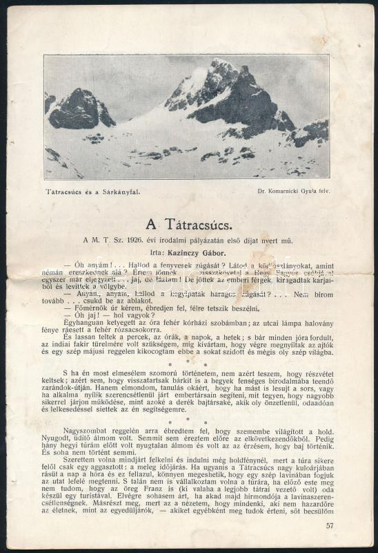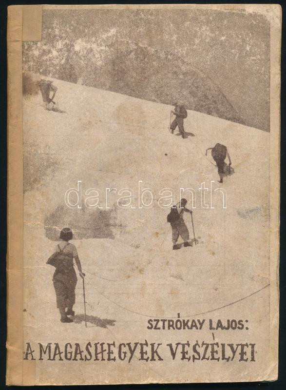 Sztrókay Lajos: A magashegyek veszélyei. Bp.,(1943),Magyar Sí és Turistaélet, 48 p. Benne plusz lapokkal, rajtuk: Kazinczy Gábor: A Tátracsúcs című írásával. Kiadói papírkötés, kopott borítóval, javított kötéssel és gerinccel.