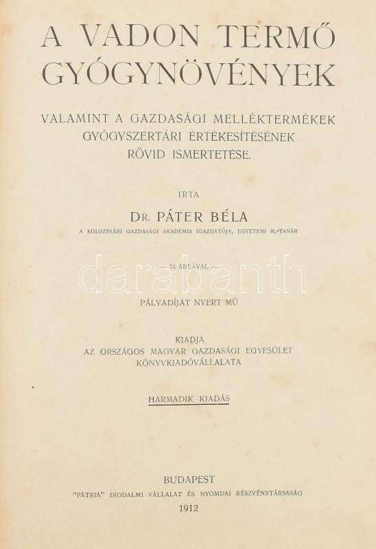 Dr. Páter Béla: A vadon termő gyógynövények. 74 ábrával Bp., 1912. Pát... https://www.darabanth.com/hu/466-Gyorsarveres/466.0/Konyvek/Konyvek-Termeszettudomany-medicina~500044/Dr-Pater-Bela-A-vadon-termo-gyogynovenyek-74-abraval-Bp-1912-Patria-Kiadoi-kopott-~II3146619