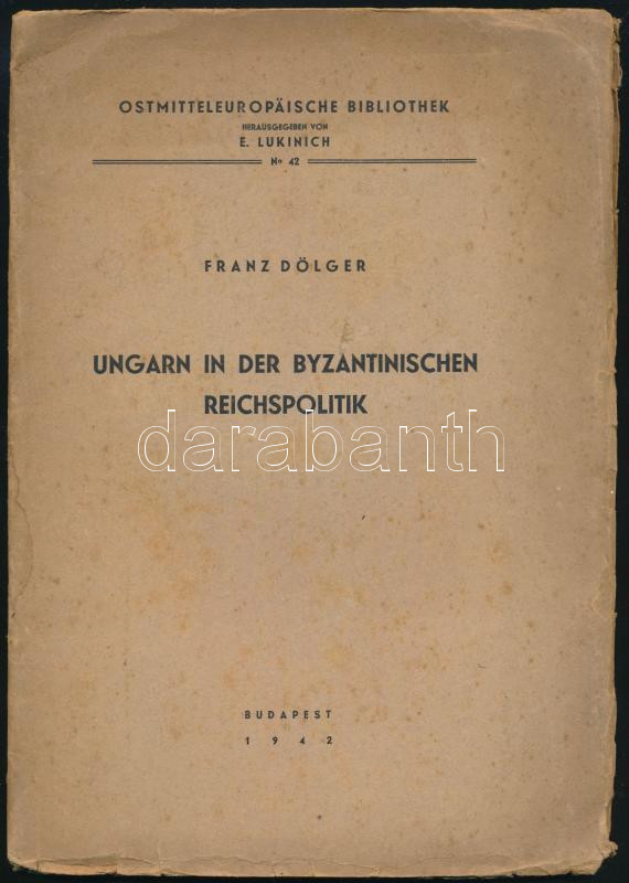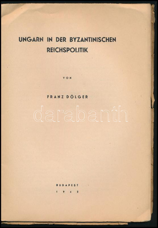Franz Dölger: Ungarn in der Byzantinischen Reichspolitik. Ostmitteleuropäischer Bibliothek No. 42. Bp., 1942., (Sárkány-ny.), 32 p. Kiadói papírkötés, foltos borítóval, a borítószéleken kis szakadásokkal.