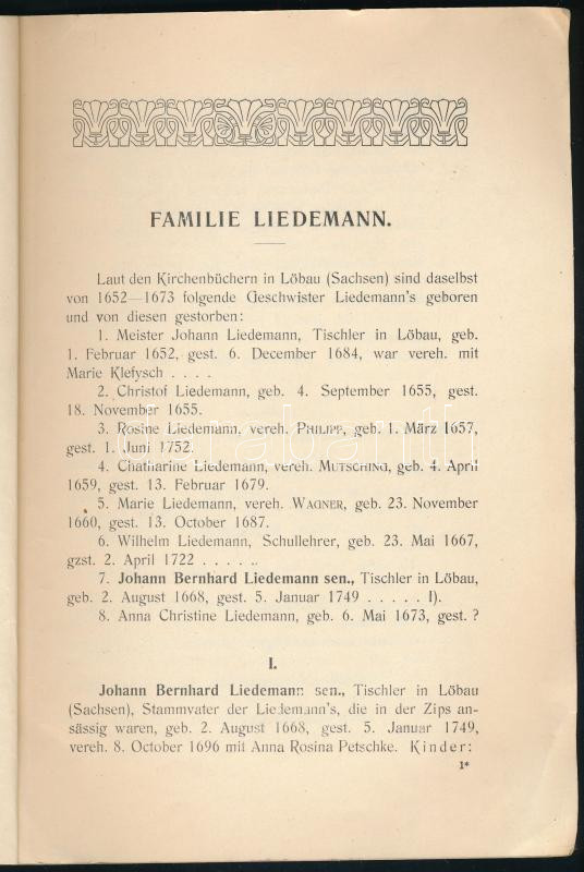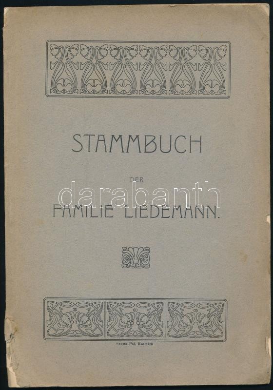 Leírás: Stammbuch der Familie Liedemann. Késmárk, é-.n- ca 1910. Sauer Pál. 32 p + 1 kih t. Kissé sérült kiadói papírborítóval. Családtörténet.