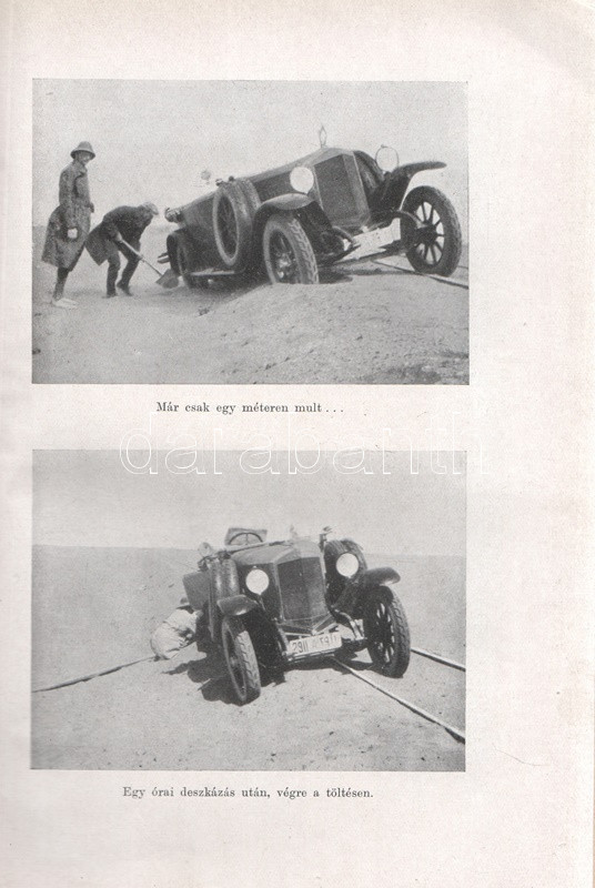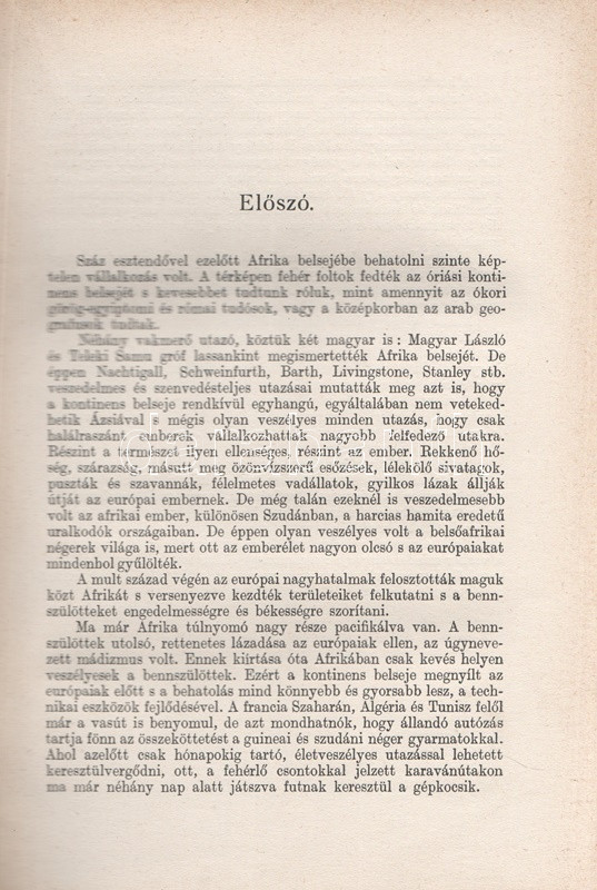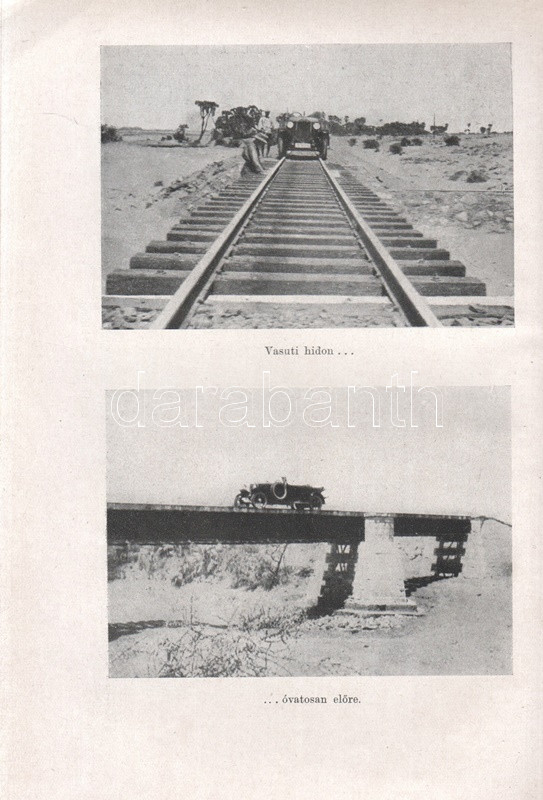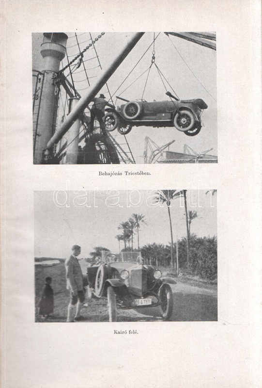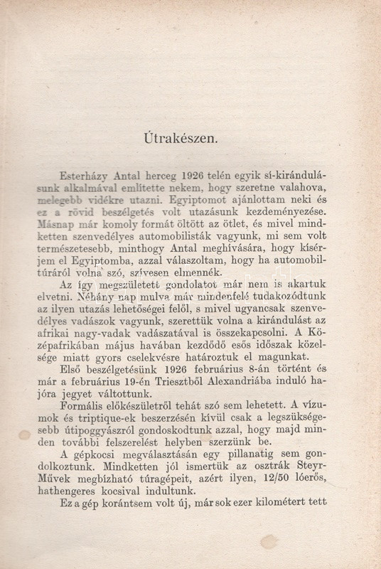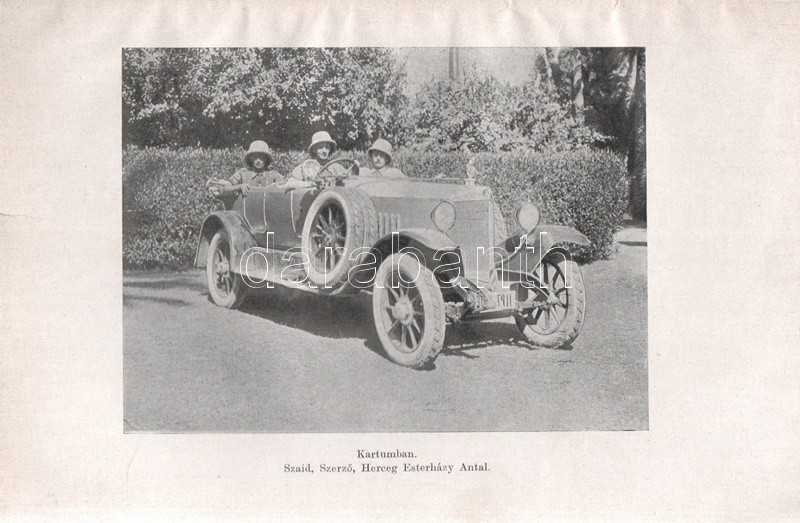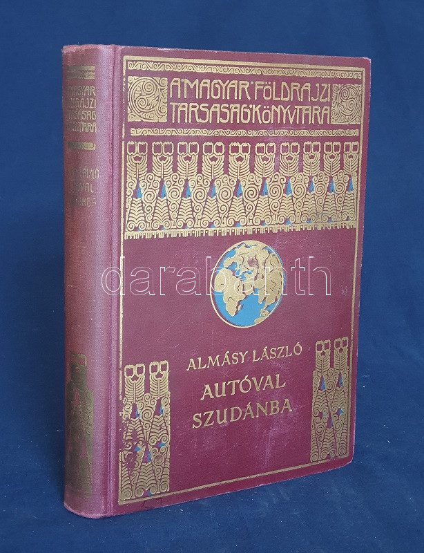 Almásy László: Autóval Szudánba. Első autó-utazás a Nílus mentén. Vadászatok Angol-Egyiptomi Szudánban. Cholnoky Jenő előszavával. 83 képpel és egy térképpel. [Első kiadás.] Budapest, [1929]. Lampel Róbert - Wodianer F. és Fiai Könyvkiadóvállalata (Franklin-Társulat ny.) 1 t. (címkép) + 240 p. + 28 t. (kétoldalas), Az Almásy László és Esterházy Antal közös, 1926. évi afrikai felfedező- és vadászútjáról szóló beszámoló először 1929-ban jelent meg, ezt a kiadást két éven belül két kiadás követte. Az egyes kiadások közti különbség a kötéstábla feliratozásában, az illusztrációs anyagban és a térkép meglétében vagy nem létében körvonalazható. Az 1929. évi első kiadás 83 fényképpel és 1 kihajtható térképpel rendelkezik, a gerincen és az első kötéstáblán pedig az ,,Autóval Szudánban" téves címfelirat olvasható. A kötés feliratozását a második és harmadik kiadásban már javították, ott már ,,Autóval Szudánba" felirat olvasható; a második és harmadik kiadás pedig egységesen nélkülözi a térképet, és 83, illetve 82 felvétellel jelent meg, az 1930., illetve az 1931. évben. Példányunk belíve az 1929. évi első kiadásból származik, ám belívét az 1930. évi második kiadás kötéstáblájába kötötték, két táblája duplán szerepel, ám nélkülözi a térképet. (A Magyar Földrajzi Társaság könyvtára.) Vuray 26. Díszesen aranyozott, festett kiadói egészvászon kötésben. Jó példány.