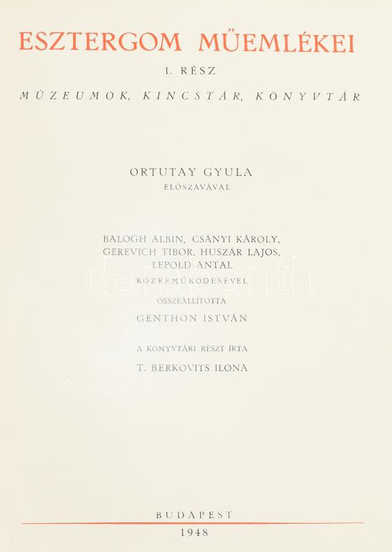Esztergom műemlékei. 1. rész: Múzeumok, kincstár, könyvtár. Ortutay Gyula előszavával. Összeáll.: Genthon István. Magyarország Műemléki Topográfiája I. kötet. 1. rész. (Unicus!) Bp., 1948, Műemlékek Országos Bizottsága (Egyetemi Nyomda), VII+(1)+387+(5) p. Gazdag szövegközi és egészoldalas fekete-fehér képanyaggal illusztrálva. Kiadói félbőr-kötés, kissé kopott gerinccel, részben kissé fakó borítóval, egyébként jó állapotban. Ritka!