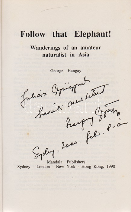 Dedikált: ,,Juhász Györgynek baráti szeretettel Hangay György. Sydney, 2000. febr. 6-án". Oldalszámozáson belül a szerző szövegközti rajzaival és karikatúráival. A táblák fotóanyaga szintén a szerzőtől származik.