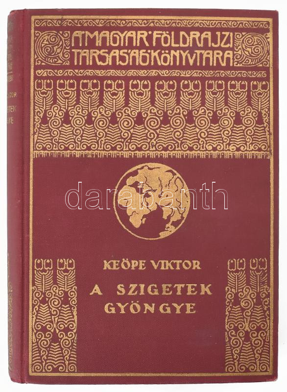 Keöpe Viktor (1883-1970): A szigetek gyöngye. Magyar Földrajzi Társaság Könyvtára. Bp.,[1936.], Franklin, 189+3 p. + 20 t. (kétoldalas) + 1 térkép (kihajtható). Egyetlen kiadás. Kiadói dúsan aranyozott egészvászon-kötés, kissé kopott borÃtóval.