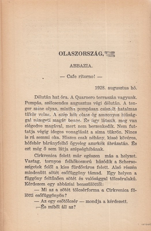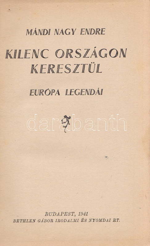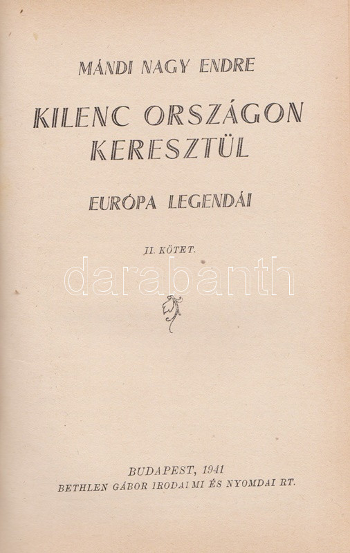 Mándi Nagy Endre: Kilenc országon keresztül. Európa legendái. I-II. kötet. [Teljes, egybekötve.] Budapest, 1941. Bethlen Gábor Irodalmi és Nyomdai Rt. 260 p. + 31 t. (kétoldalas); 114 + [2] p. + 11 t. (kétoldalas). Egyetlen kiadás. Mándi Nagy Endre fővárosi jegyző anekdotákkal és történelmi összefoglalókkal tarkított úti beszámolói Európában és a Mediterráneumban megtett, 1930-as évekbeli utazásairól. Az utazó a legnagyobb terjedelmet Olaszországnak szenteli, mellette az Angliát, Németországot, Franciaországot, Marokkót, Portugáliát és a Nyugat-Balkán országaiban tett út művelődési és életmódbeli, nemzetjellemtani benyomásait rögzíti. Aranyozott, sérült korabeli egészvászon kötésben, a hátsó kötéstáblán halvány foltosság.
