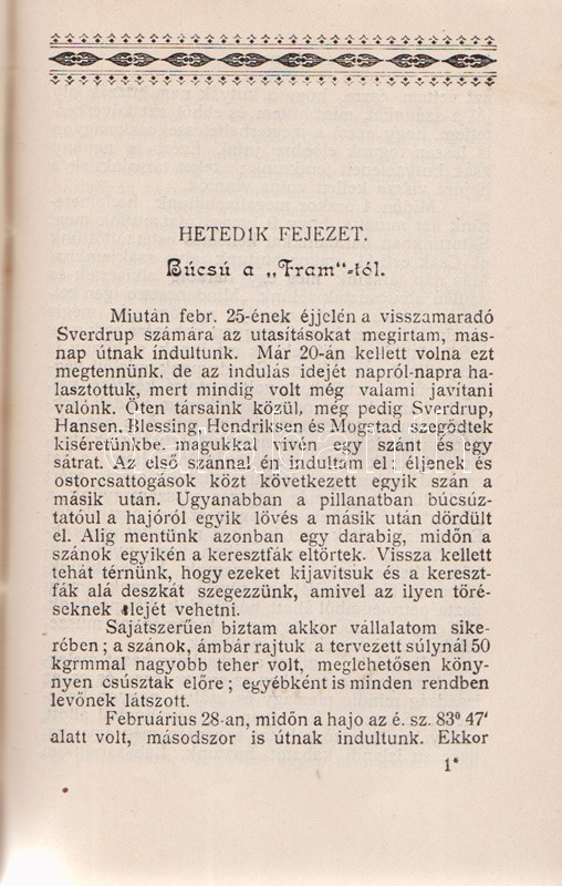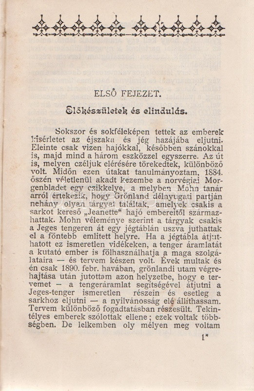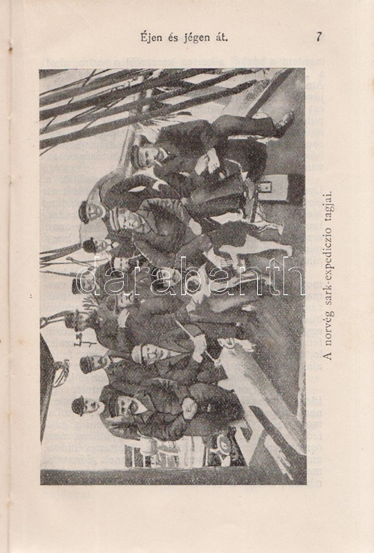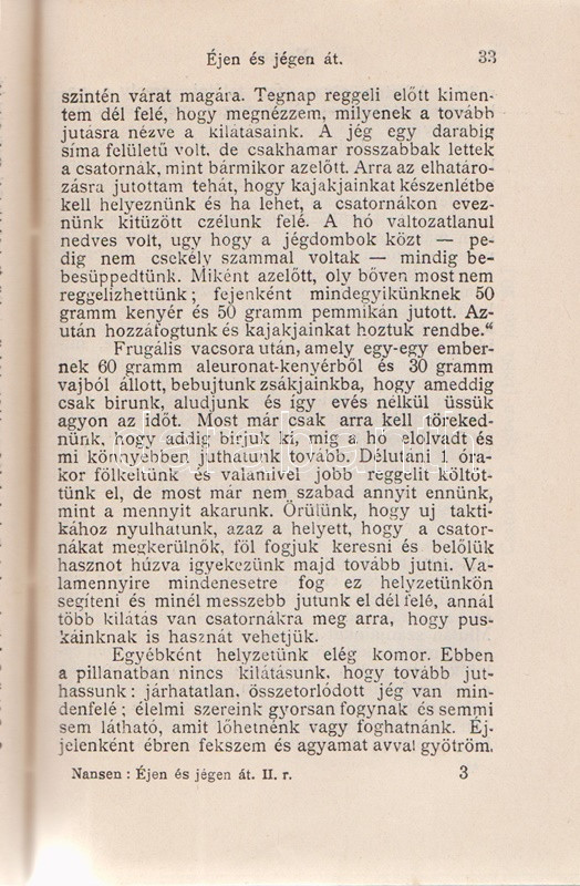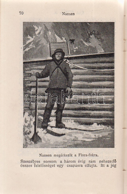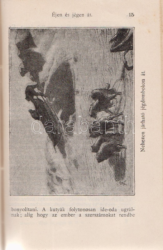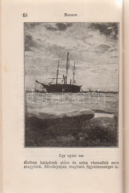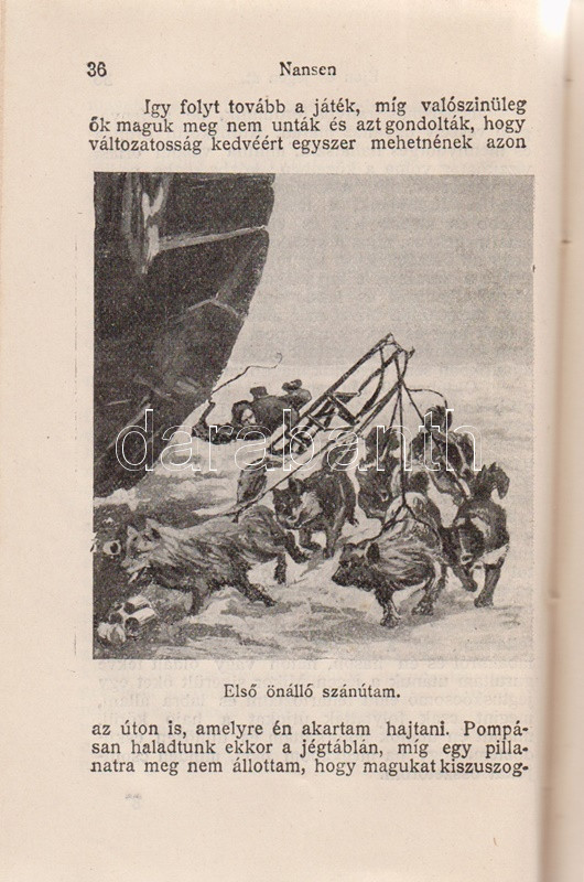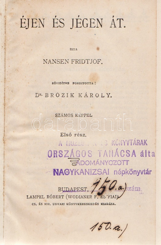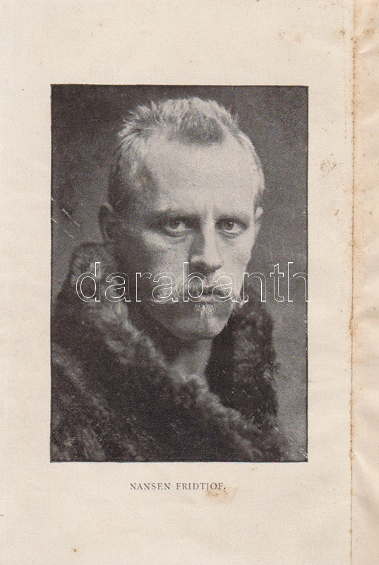 Nansen, Fridtjof: Éjen és jégen át. Rövidítve fordította: Brózik Károly. Számos képpel. 1-2. rész. [Teljes, egybekötve.] Budapest, [1898]. Lampel Róbert - Wodianer F. és Fiai (Franklin-Társulat ny.) 1 t. (címkép) + 77 + [3] p.; 79 + [1] p. Első kiadás. Beszámoló Fridtjof Nansen (1861-1930) norvég sarkkutató 1893-1896 közötti, az Északi-sarkot célzó felfedezőútjáról. A számos újítással, így például kutyaszános vontatással kísérletező expedíció nem érte ugyan el kitűzött célját, de tengerbiológiai, földrajzi kutatásai így is számottevőek. A munka eredeti nyelven 1897-ben jelent meg, ,,Fram öfver Polarhafvet, Den norska polarfärden 1893-96" címmel. Oldalszámozáson belül az expedíción készült egész oldalas felvételekkel. A címoldalakon régi gyűjteményi bélyegzés és katalógusszám. Korabeli félvászon kötésben, az első kötéstábla alsó sarkán apró kopás. Jó példány.