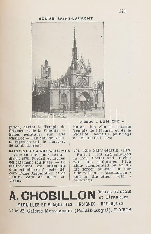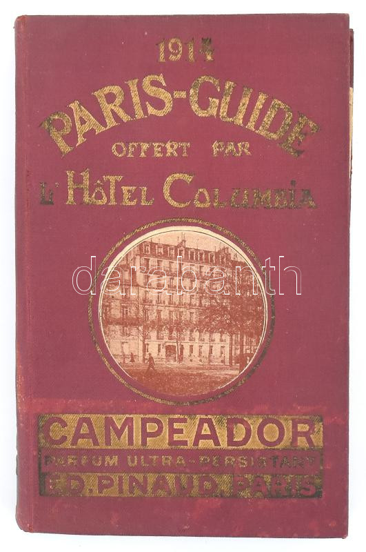 Paris-Guide offert par l'Hotel Columbia. Paris, 1914, Imp. Centrale de la Bourse. Francia nyelven. Gazdag korabeli képanyaggal illusztrált. Korabeli reklámokkal. Épületekkel illusztrált kihajtható térkép-melléklettel. Kiadói kopott aranyozott egésvászon-kötés.