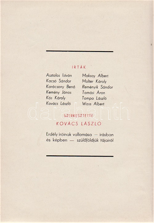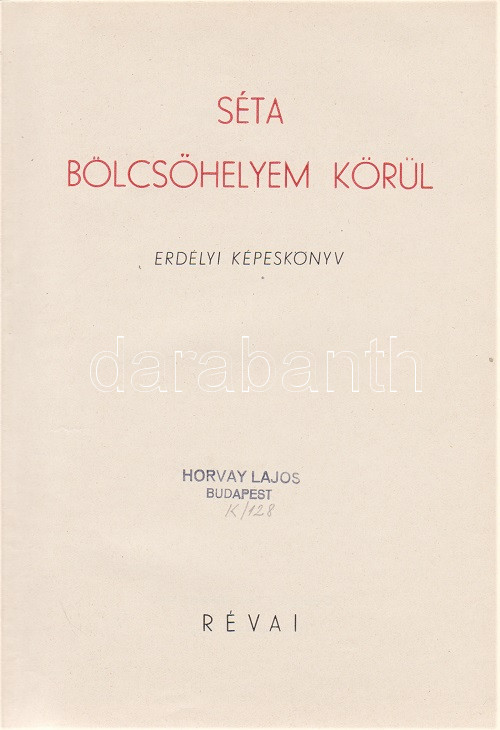 Séta bölcsőhelyem körül. Erdélyi képeskönyv. Szerkesztette Kovács László. [Erdély íróinak vallomása - írásban és képben - szülőföldük tájairól. Írták: Asztalos István, Macsó Sándor, Karácsony Benő, Kemény János, Kós Károly, Kovács László, Maksay Albert, Molter Károly, Reményik Sándor, Tamási Áron, Tompa László, Wass Albert.] (Budapest, 1940). Révai (ny.) 198 + [18] p. szkennelve, átméretezve. Oldalszámozáson belül igen gazdag - összesen 97 oldalnyi - kortárs fotóanyaggal. A címoldalon régi tulajdonosi bélyegzés. Poss.: Horvay Lajos (Ex libris). [Horvay Lajos: tisztségviselő, Szombathely városának háztartási főszámvevője és a Vasvármegyei Elektromos Művek Rt. felügyelőbizottsági tagja az 1930-as évek második felében.] Vaknyomásos kiadói kartonkötésben. Jó példány.
