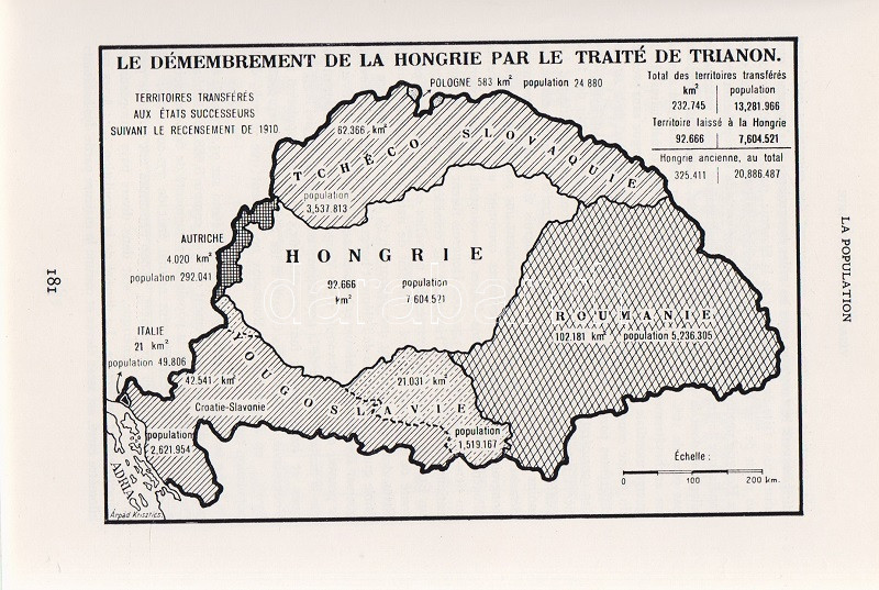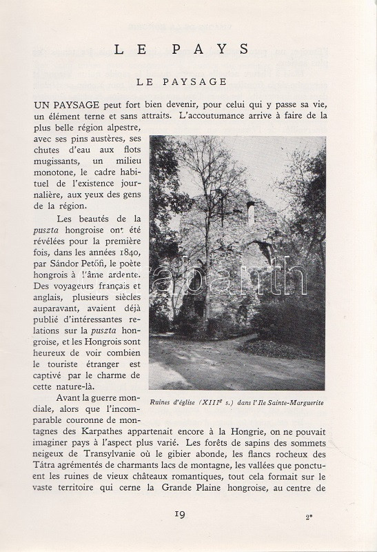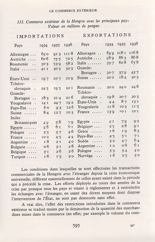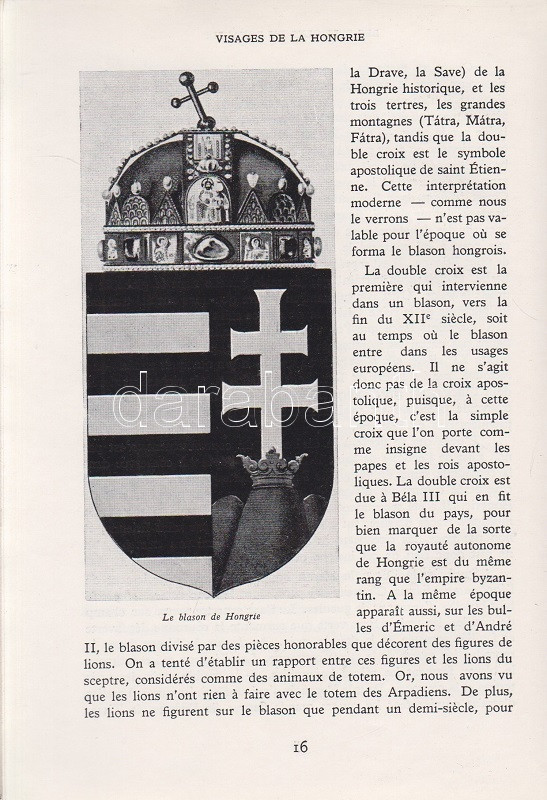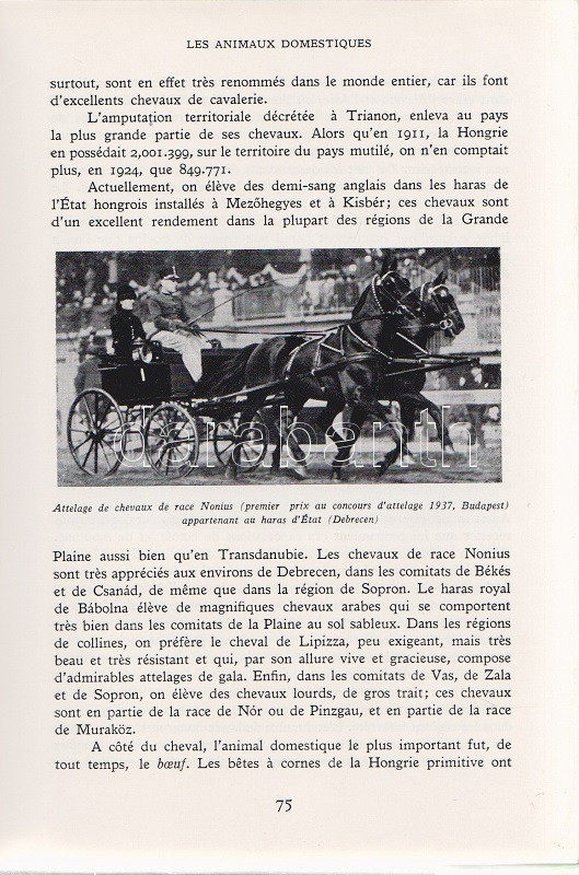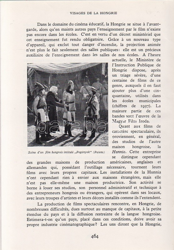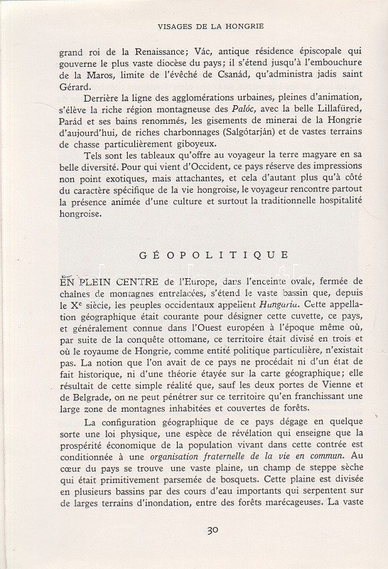 Visages de le Hongrie. Ouvrage orné de 257 illustrations. Paris, 1938. Librarie Plon (Imprimerie et édition des Presses Univeritaires de Hongrie). 621 + [1] p. + 1 térkép (színes, kihajtható). Egyetlen kiadás. szkennelve, átméretezve. antik XX., magyar nyelv, francia, nyelv. statisztika, politika, néprajz, országismertetők, történelem, művészetek, gazdaság. Magyarország 1919-1945. Oldalszámozáson belül 257 szövegközti fényképpel, grafikonnal, ábrával gazdagon illusztrált országismertető kötet, mely a kulturális-történelmi és természetrajzi részleteken kívül bőségesen taglalja az ország társadalmi, politikai, gazdasági, tudományos, művészeti és néprajzi részleteit (jelentős helyet biztosítva a műépítészet mellett az originális népi építészetnek, a képzőművészet mellett a sajátosan magyar népművészetnek, a műzene mellett a népzenének) - valamint az olvasóközönségre való tekintettel áttekinti a magyar-francia kapcsolatokat is. A szöveget neves magyar akadémikusok írták, többek között Győrffy István néprajzkutató, Fitz József művelődéstörténész, Hankó Béla ornitológus, Kodály Zoltán zeneszerző. A mű egészéből egy, a hagyományait őrző, de a korszerű modernizáció fejleményeit is birtokló ország képe bontakozik ki. A kötetből 30 számozott példány is készült, példányunk számozatlan. Az első nyomtatott oldalon és a címoldalon régi tulajdonosi bejegyzés, illetve bélyegzés. Kiadói egészvászon kötésben. Jó példány.