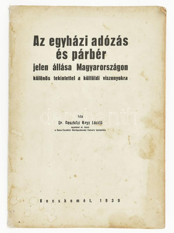 Gesztelyi Nagy László: Az egyházi adózás és párbér jelen állása Magyar... https://www.darabanth.com/hu/466-Gyorsarveres/466.0/Konyvek/Konyvek-Vallas~2000335/Gesztelyi-Nagy-Laszlo-Az-egyhazi-adozas-es-parber-jelen-allasa-Magyarorszagon-Kecskeme~II3088852