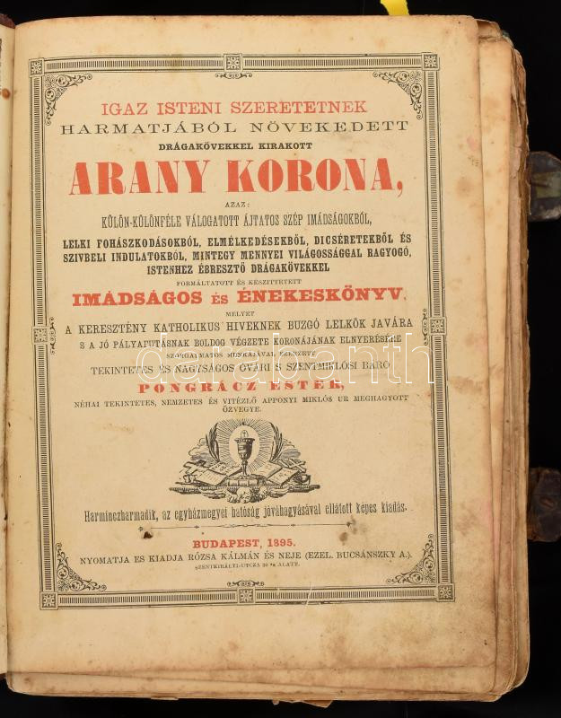 Pongrácz Eszter: Igaz isteni szeretetnek harmatjából nevelkedett drága kövekkel kirakott arany korona [...] imádságos és énekes könyv. Bp.,1895, Rózsa Kálmán és neje, 1 t.+8+460+IV p. Harmincharmadik kiadás. Korabeli aranyozott egészbőr-kötés, rézveretekkel és rézkapcsokkal, laza fűzéssel, kijáró lapokkal, foltos, sérült lapokkal. Megviselt állapotban.