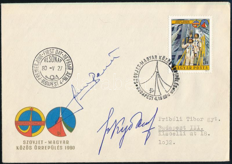 Leírás: 1980 Farkas Bertalan (1949-) és Valerij Kubaszov (1935-2014) űrhajósok aláírása borítékon