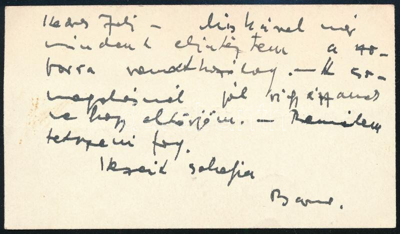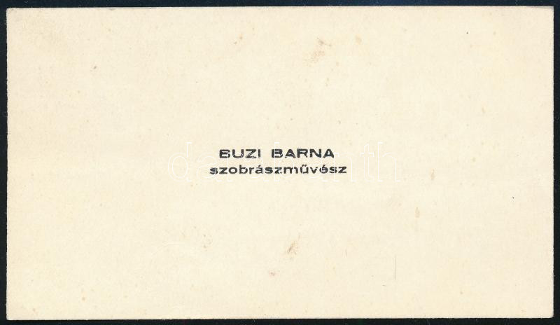 Leírás: Buzi Barna (eredeti nevén Buzi Barnabás, később Búza Barna) (1910-2010) szobrász, éremművész autográf aláírása és sorai névjegykártyája hátoldalán