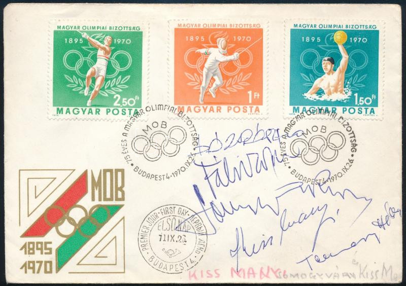 Fábri Zoltán (1917-1994) rendező, Kiss Manyi (1911-1971), Somogyvári Rudolf (1916-1976), Dózsa László (1942-2023), és két másik színművész autográf aláírása levélborítékon