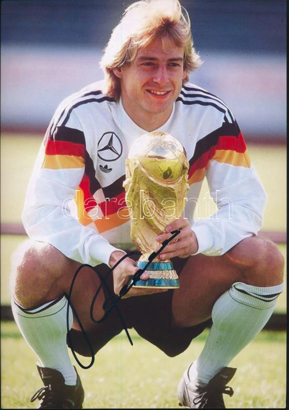 Jürgen Klinsmann (1964- ) német labdarúgó, az 1990-es világbajnokság győztes csapatának tagja, edző aláírása őt ábrázoló képen, tanúsítvánnyal, 29,5x21 cm / Jürgen Klinsmann (1964- ) German footballer, 1990 World Cup winner, coach's signed photo, with certificate
