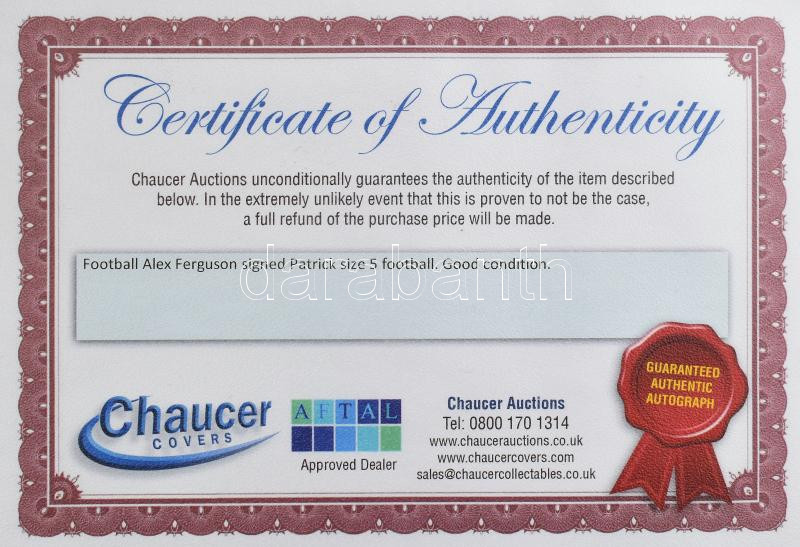 Sir Alex Ferguson (1941- ) skót labdarúgó, a Manchester United legendás edzőjének aláírása focilabdán (Patrick 5-ös méretű labda), tanúsítvánnyal / Signature of Sir Alex Ferguson (1941- ) Scottish footballer, Manchester United's legendary coach, on a football (Patrick size 5 ball), with certificate