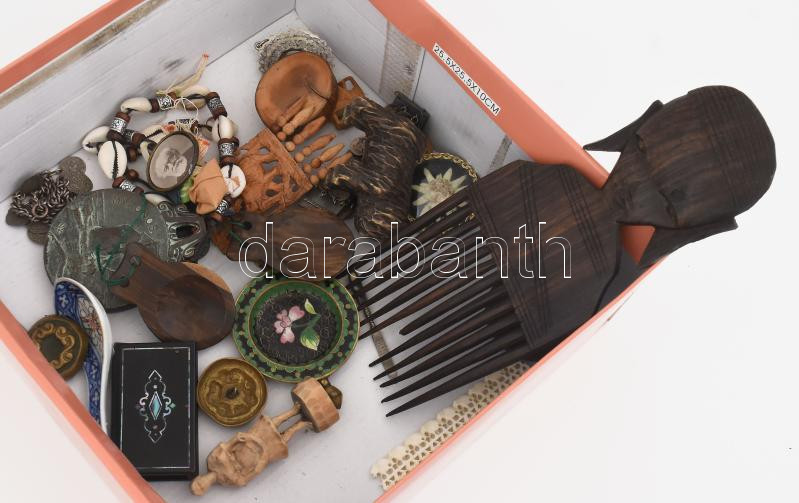 Leírás: Doboznyi minőségi bolha tétel, közte jó darabokkal, faragványok, antik bross, lakkozott tárgy, stb.