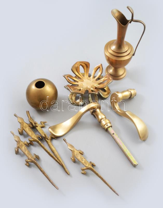 Leírás: Vegyes réz tárgyak. Kilincsek, gyík formájú késbakok. stb